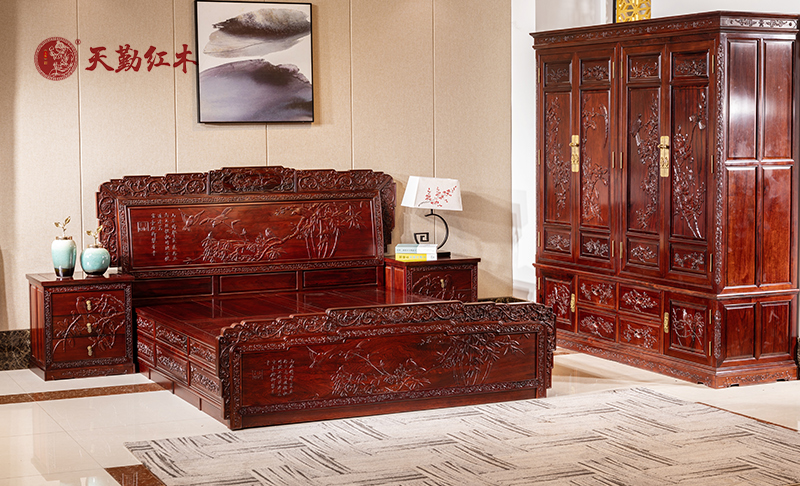 天勤紅木 紅木家具紅酸枝(學(xué)名:巴里黃檀)盛世和諧畫鳥大床紅酸枝圖片及家具信息